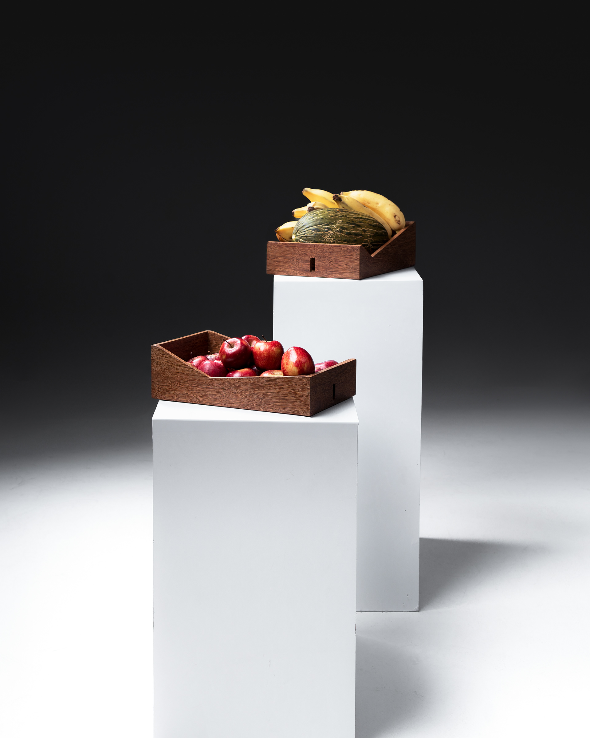 Feita em Sucupira, a Fruteira DaFeira valoriza a beleza das madeiras brasileiras, explorando uma composição sofisticada de planos e recortes.